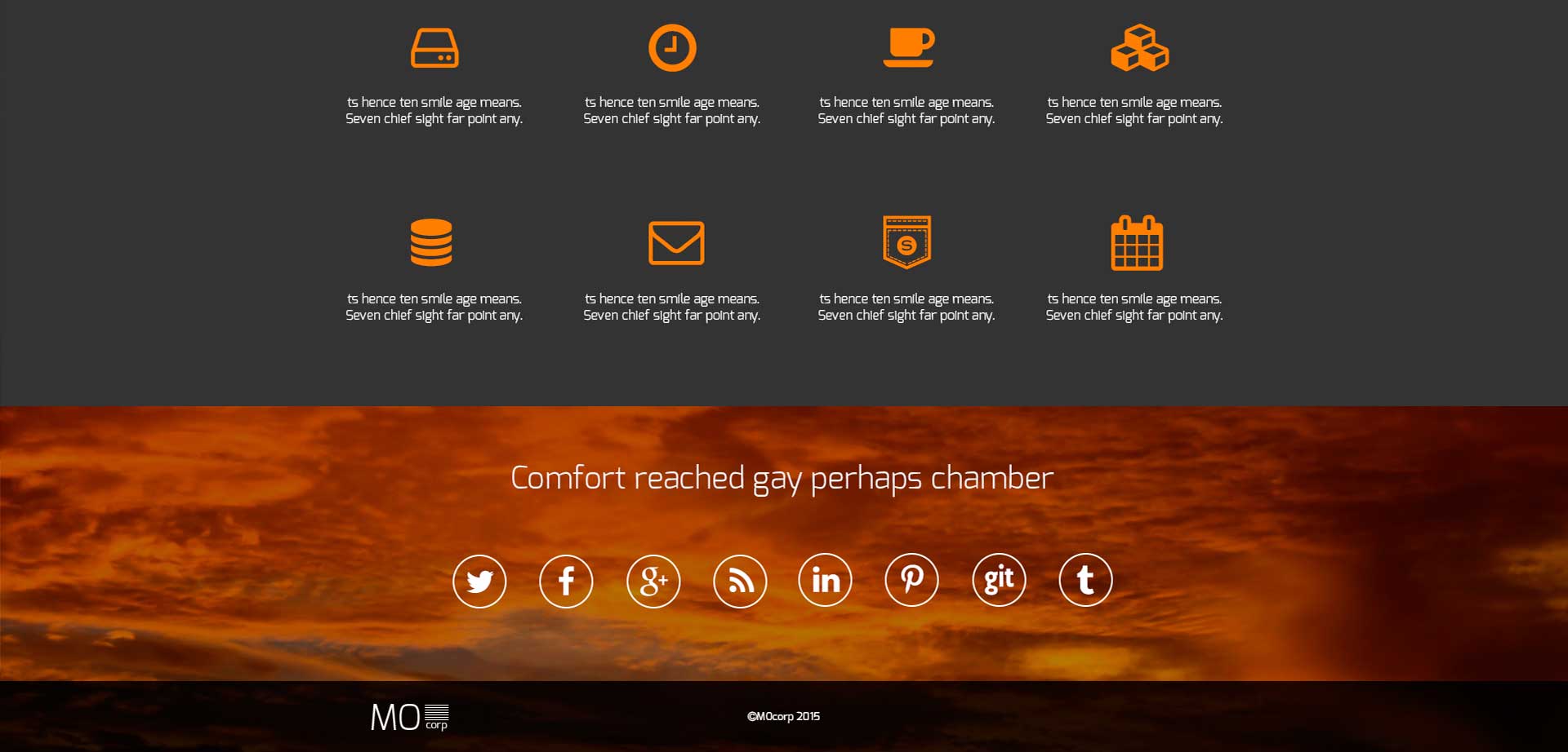 The template, that is called “Mocorp” and presented in this section, is a perfect solution for a large company. Bright and energetic colors perfectly emphasize the status of its owner and can be a reflection of its potential. The combination of bright orange and dark gray create a unique combination and a unique style. Such combination of colors emphasizes on a strong and strong-willed nature of the site owner.